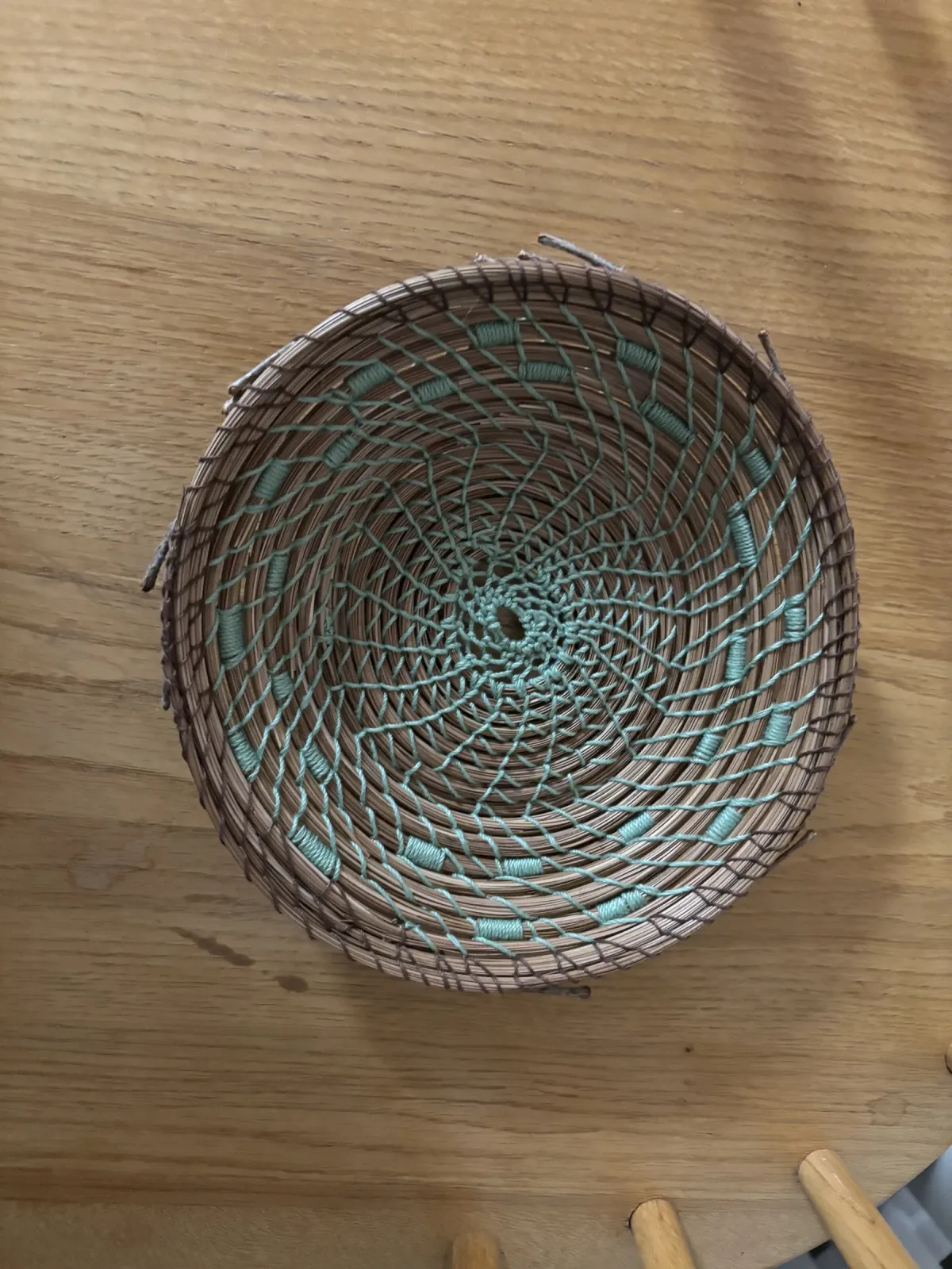 woven basketcrafthandmadepine needle basketryspiral patternteal threadwooden backgroundRealismStorytelling / NarrativeStill Life / ObjectsHistorical / Cultural