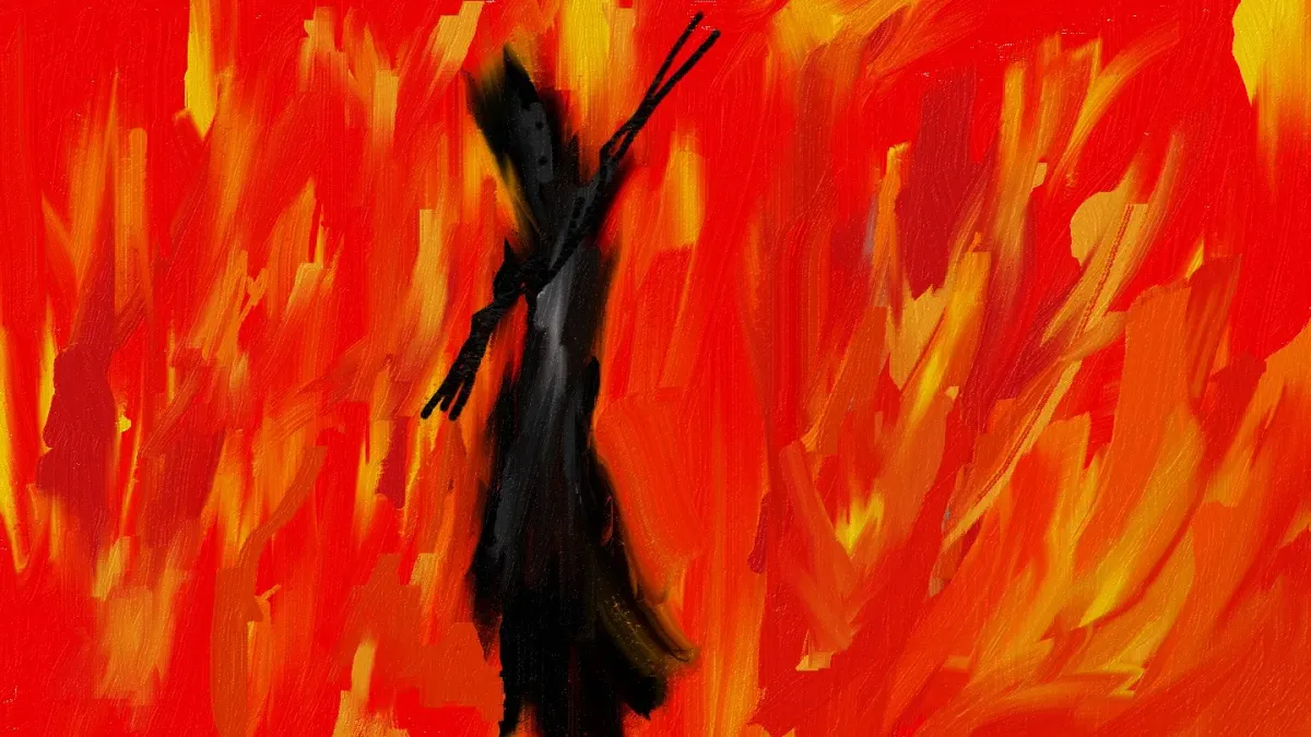 Abstractflamessilhouettedark figureexpressionistintensefieryAbstractExpressionism / EmotionalBold / GraphicDark / DramaticStorytelling / NarrativeAbstract / ConceptualConflict / SacrificeSpiritual / Symbolic